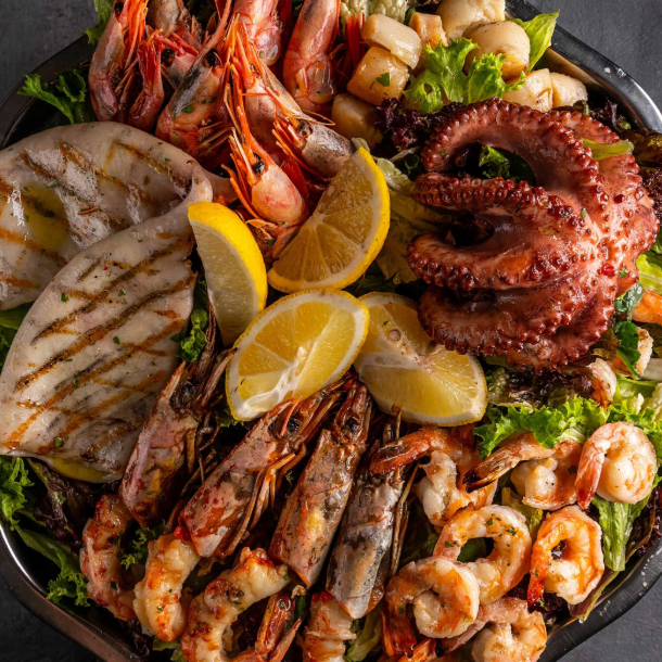 (Good for 3) Pangrilled to Perfection, Squid Flower Squid Rings, Tuna Panga, Blue Marlin, Tiger Shrimps, Assorted Shells, Mussels, Pickled Cucumber and Carrots